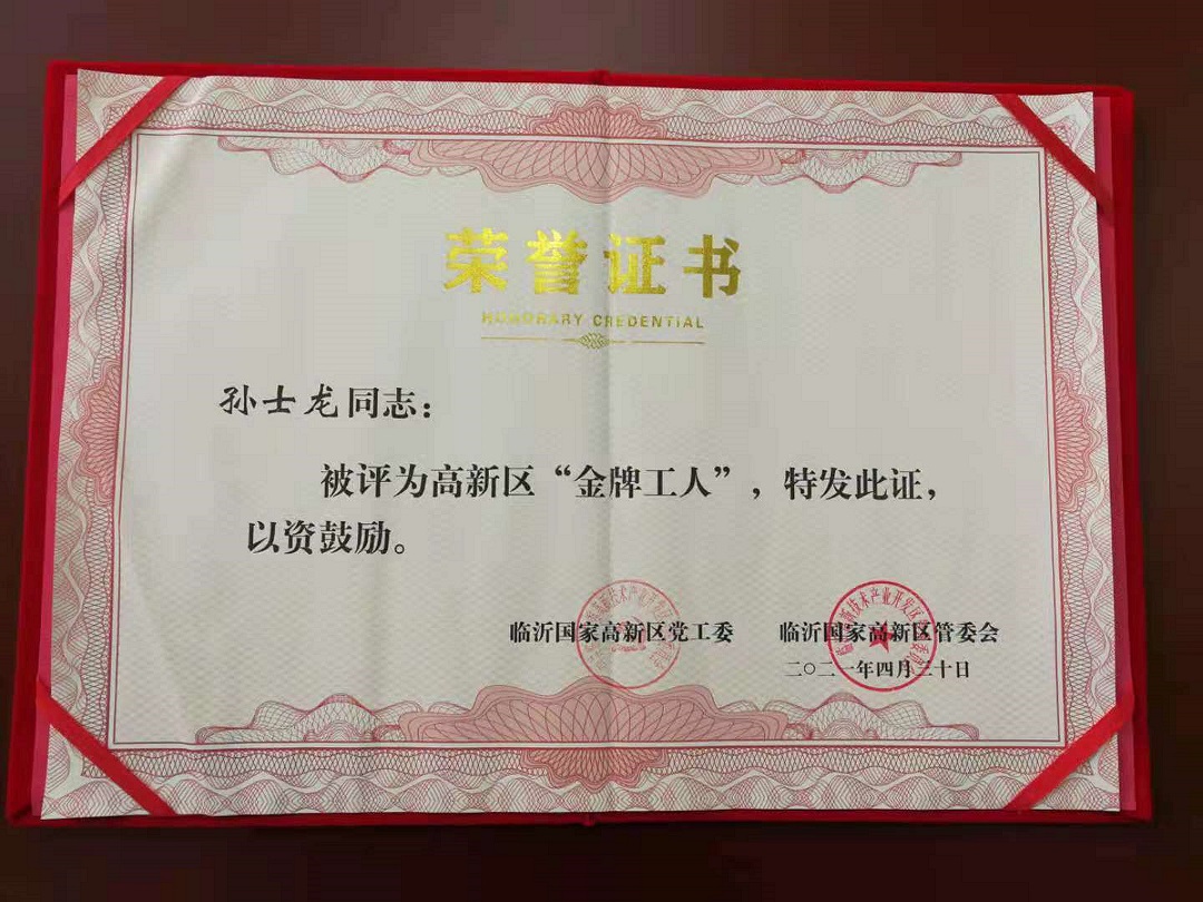 2021年4月30日我公司裝配車間裝配技師孫士龍同志被評為臨沂市高新區(qū)“金牌工人”,特對孫士龍同志表示熱烈的祝賀!
